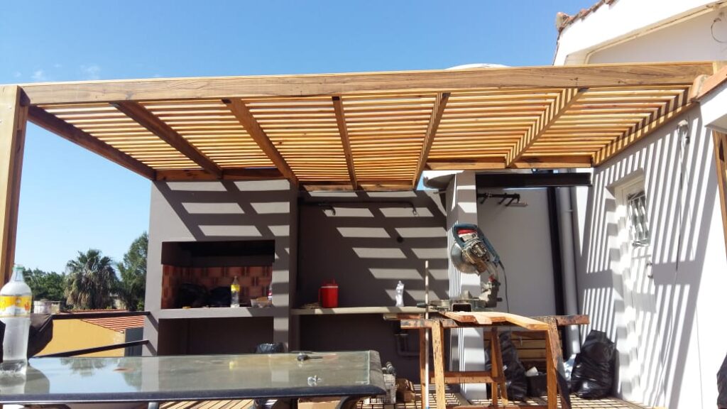Nuestras Pérgolas de madera las realizamos con columnas dobles formadas por tirantes 2″x5″, vigas perimetrales de 2″x6″ y vigas interiores de 2″x5″, sobre las vigas armamos un entramado de tablas eucalipto 1″x3″ separadas entre si 7cm para dejar pasar la luz y luego chapas traslúcidas acanalada plásticas antigranizo, todo protegido con pintura con Petrilac Protector para Maderas 2 manos. De esta manera aseguramos una larga duración de la pérgola y un muy bajo trabajo de mantenimiento.